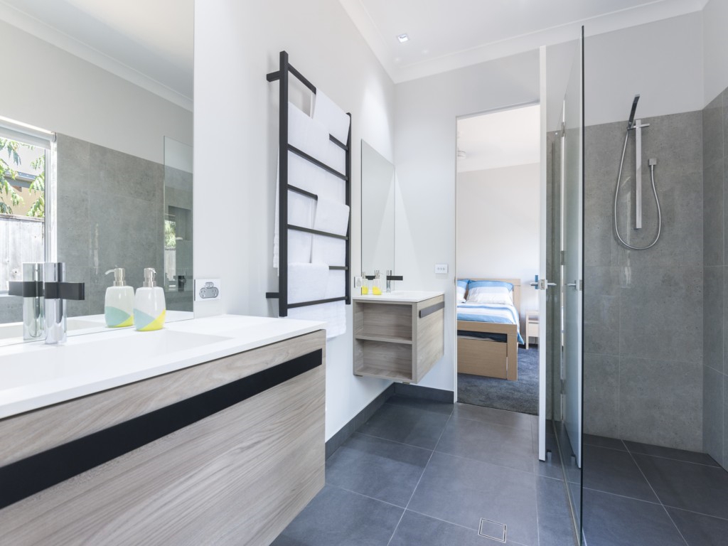 The 3rd bedroom has a Queen sized bed, a walk in robe and shares a Jack& Jill central bathroom with bedroom 4 which includes 2 single beds and a walk in robe.